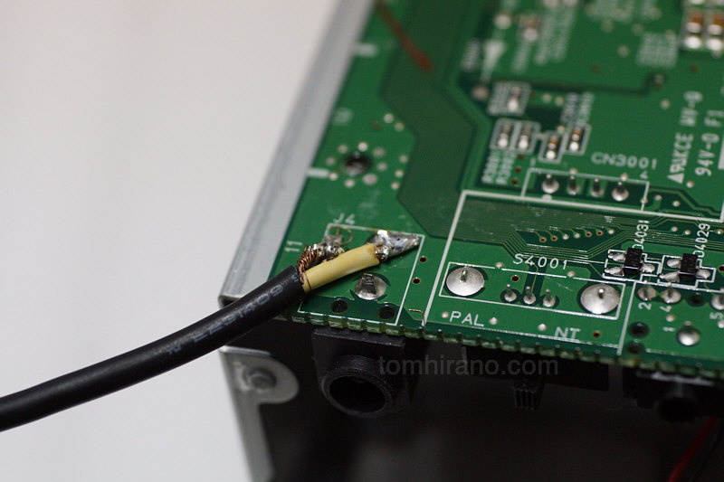 シャーシがゆがんでカバーがはまらなかった部分があったので、ペンチで修整。見た目はだいぶマシに。その後、通電するかテストしようと裏面を見ると、見慣れない形状のDCジャック。おまけに1台のジャックは破損している。一度も見たことのないプラグだったので、毎度ながら荒業。DC 12V 1.08A を満たすアダプターを探し、線を剥き剥き。基盤に直付けw