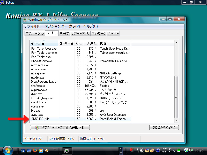 セットアップのようこそ画面が出たら、タスクマネージャー等を使い 背後で動いているインストール本体 _INS0432._MP を探します。