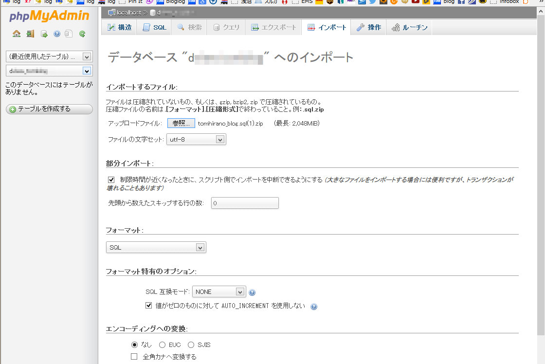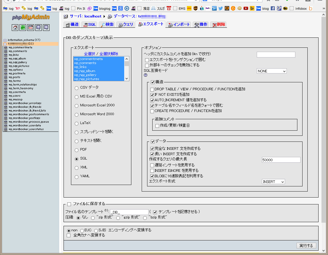 記事はデータベース内に含まれているので、データベースの文字コードの違いというのは分かったのだけど、SQLのダンプファイルを作る際、どこで文字コードをセットするのかわからず四苦八苦。MySql phpMyAdminにアクセス、オプション項目をウロウロ。エクスポート画面を見てもそれらしいのがない。