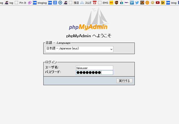 phpMyAdminログイン画面、「Japanese」の脇に小さくEUCと。