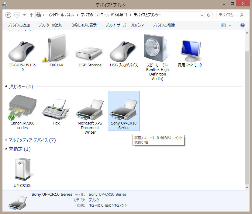 コントロールパネルから「デバイスとプリンター」を開いて、プリンター欄にSony UP-CR10 series と出ればOKです。たぶん。きっと。
