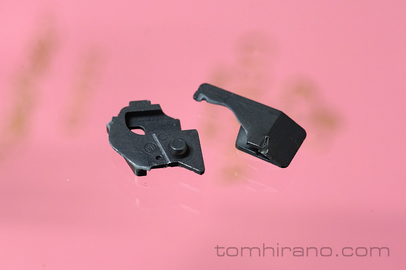 やっぱり歪んでますね。でも、この角度の写真じゃよくわかりませんね、すみません。分解途中、なんか別の部品も転がって出てきました。部品も割れてますね(笑)