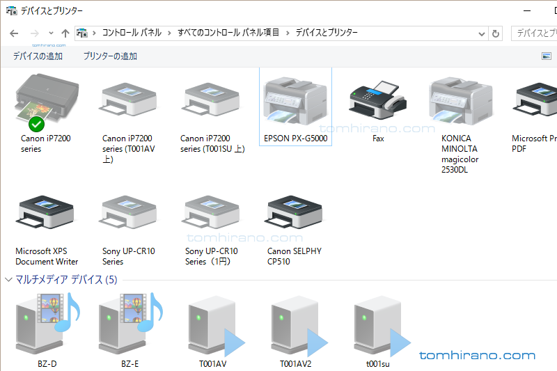 続いて、肝心なプリンターを接続。プリンタをUSBで繋ぎ、電源を入れると「新しいハードウェア~ なんちゃら」って出て、自動的に登録されるはず。 インストール完了が出たら、念のため、コントロールパネル>デバイスとプリンタ、または 設定>デバイス を覗いてCP510のアイコンがあるかチェック。