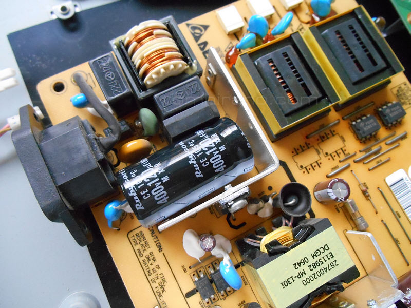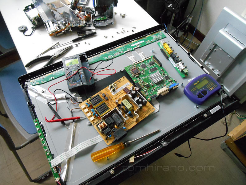 先日仕事をしていると、液晶モニターの電源が突然落ち、スタンバイ電源ランプも全く付かなくなる状態に。いよいよ買い替えか、と思ったものの、電源だったら何とかなるかなと思い、早速開けてみた(笑)