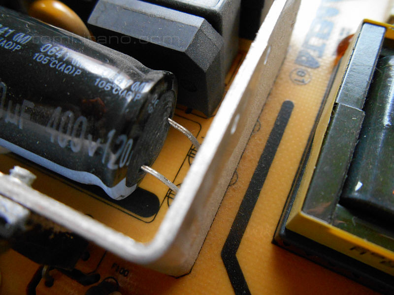 スタンバイのランプも付かないという事は、制御基板への電源が流れてないのかも?と思い、大本の電解コンデンサーかなと。あ、良く見ると、膨らんでる。